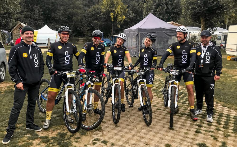 Team #aanKOP. Links en rechts begeleiders Chiel en Dave. Fietsers: Martin, René, Linda, Lieke en Marius.