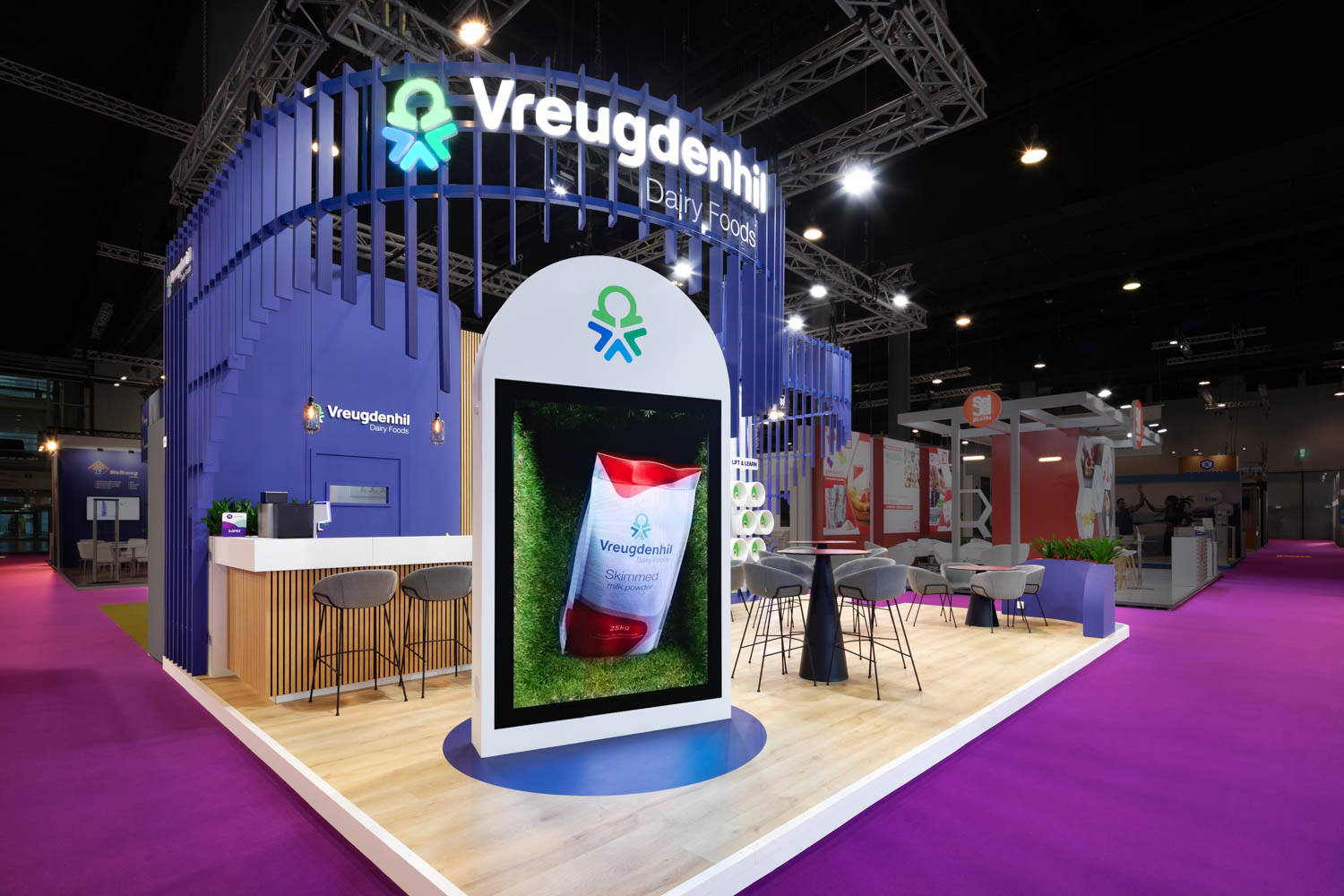 De stand was een opvallende verschijning. Het strakke design combineert zichtbaarheid en functionaliteit: de dochterondernemingen waren op de wanden geplaatst, terwijl de naam Hardeman Egg Group op strategische plekken prominent aanwezig was. De led-wall met het reusachtige ei trok de aandacht van iedereen in de hal en nodigde uit om dichterbij te komen.